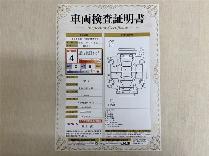 詳細及び現状の車両状態につきましては、店舗スタッフまでお尋ねください。 - 注2)上記と同様の評価点・状態表を「車両検査証明書」として店舗の展示車両に搭載しております。