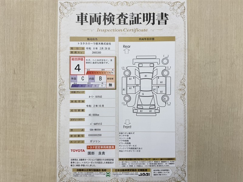 詳細及び現状の車両状態につきましては、店舗スタッフまでお尋ねください。 - 注2)上記と同様の評価点・状態表を「車両検査証明書」として店舗の展示車両に搭載しております。
