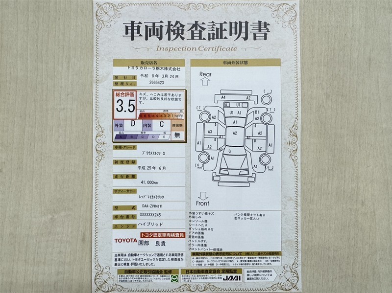 詳細及び現状の車両状態につきましては、店舗スタッフまでお尋ねください。 - 注2)上記と同様の評価点・状態表を「車両検査証明書」として店舗の展示車両に搭載しております。