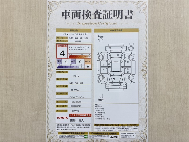 詳細及び現状の車両状態につきましては、店舗スタッフまでお尋ねください。 - 注2)上記と同様の評価点・状態表を「車両検査証明書」として店舗の展示車両に搭載しております。