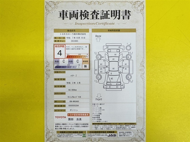 詳細及び現状の車両状態につきましては、店舗スタッフまでお尋ねください。 - 注2)上記と同様の評価点・状態表を「車両検査証明書」として店舗の展示車両に搭載しております。