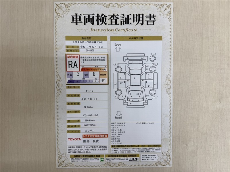 詳細及び現状の車両状態につきましては、店舗スタッフまでお尋ねください。 - 注2)上記と同様の評価点・状態表を「車両検査証明書」として店舗の展示車両に搭載しております。