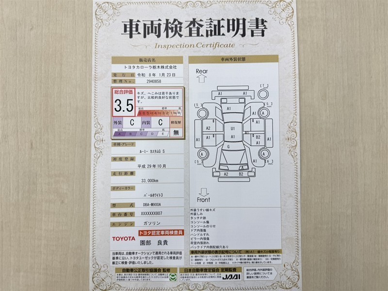 詳細及び現状の車両状態につきましては、店舗スタッフまでお尋ねください。 - 注2)上記と同様の評価点・状態表を「車両検査証明書」として店舗の展示車両に搭載しております。