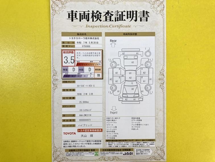 詳細及び現状の車両状態につきましては、店舗スタッフまでお尋ねください。 - 注2)上記と同様の評価点・状態表を「車両検査証明書」として店舗の展示車両に搭載しております。