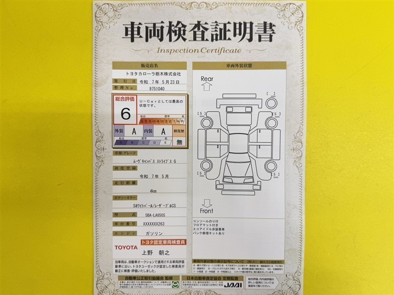 | 総合評価 | 6 | U-Carとしては最高の状態です。(新車登録後3年未満、走行距離3万キロ以内で、中古車としては最高の状態です。) | ![]() |