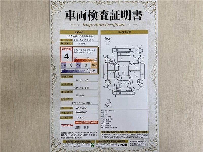 詳細及び現状の車両状態につきましては、店舗スタッフまでお尋ねください。 - 注2)上記と同様の評価点・状態表を「車両検査証明書」として店舗の展示車両に搭載しております。