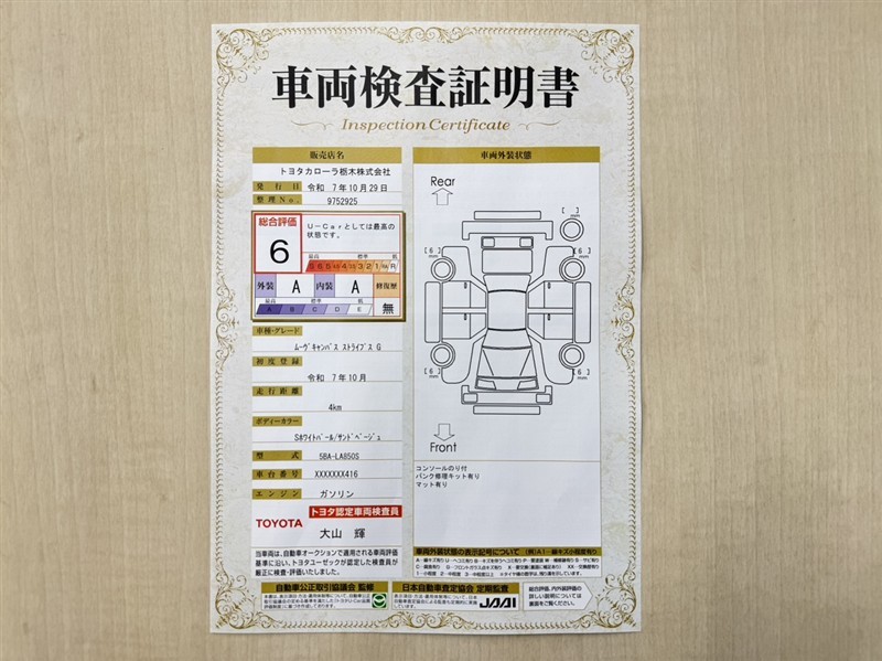 | 総合評価 | 6 | U-Carとしては最高の状態です。(新車登録後3年未満、走行距離3万キロ以内で、中古車としては最高の状態です。) | ![]() |