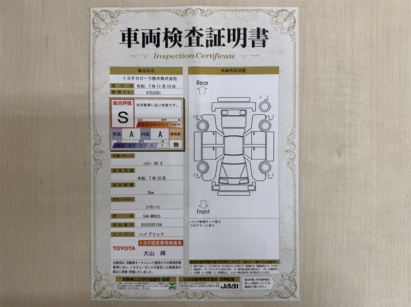 | 総合評価 | S | ほぼ新車に近い状態です。(新車登録後1年未満、走行距離1万キロ以内で、ほぼ新車に近い状態です。) | ![]() |