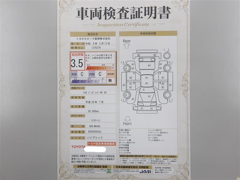 詳細及び現状の車両状態につきましては、店舗スタッフまでお尋ねください。 - 注2)上記と同様の評価点・状態表を「車両検査証明書」として店舗の展示車両に搭載しております。