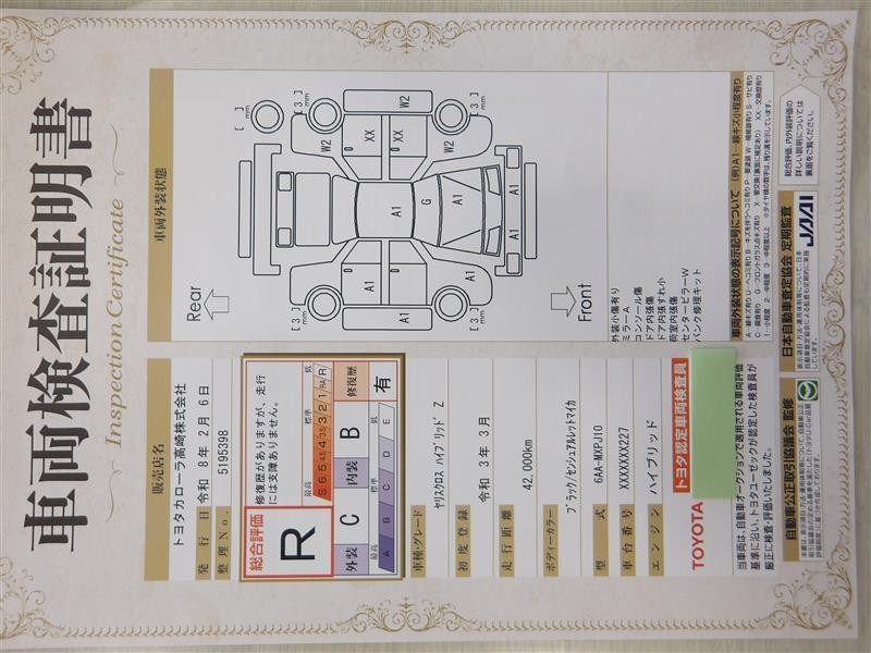 上記と同様の評価点・状態表を「車両検査証明書」として店舗の展示車両に搭載しております。
