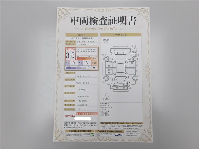 詳細及び現状の車両状態につきましては、店舗スタッフまでお尋ねください。 - 注2)上記と同様の評価点・状態表を「車両検査証明書」として店舗の展示車両に搭載しております。