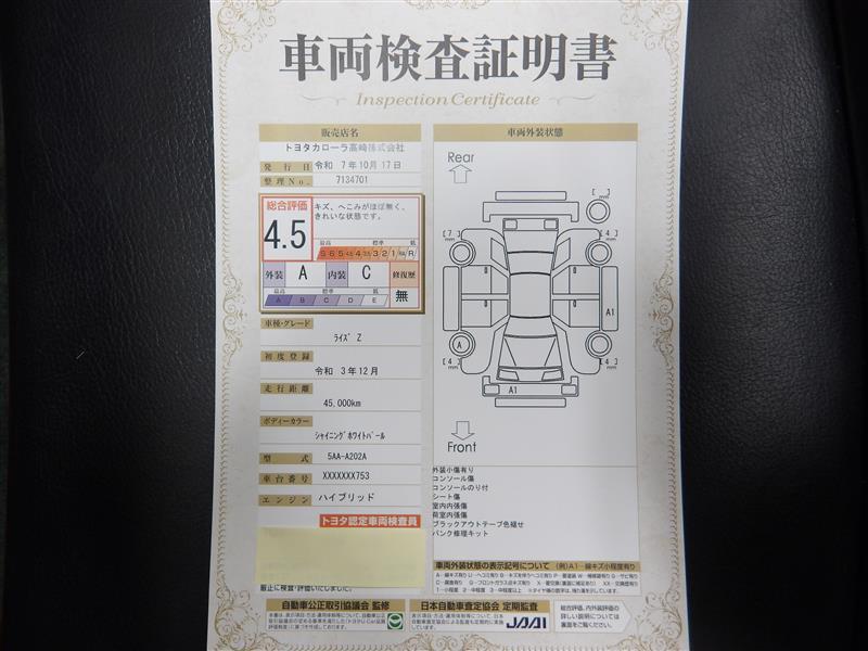 | 保証内容※1 | 保証付:ロングラン保証1年<走行距離無制限> +ハイブリッド保証<保証期間は初度登録年月から10年目まで、もしくは3年間のいずれか長い方。但し走行距離20万キロまで> |