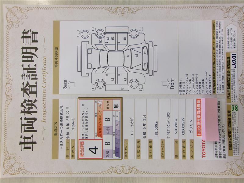 詳細及び現状の車両状態につきましては、店舗スタッフまでお尋ねください。 - 注2)上記と同様の評価点・状態表を「車両検査証明書」として店舗の展示車両に搭載しております。