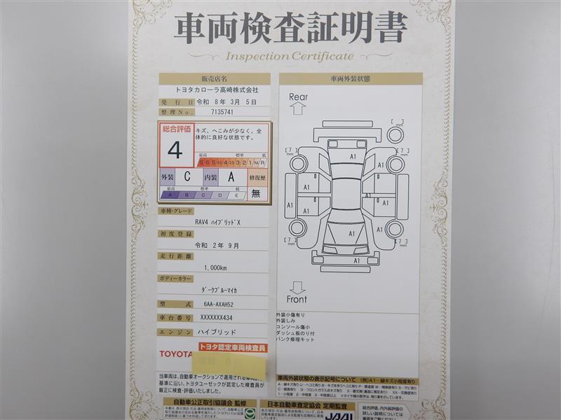 詳細及び現状の車両状態につきましては、店舗スタッフまでお尋ねください。 - 注2)上記と同様の評価点・状態表を「車両検査証明書」として店舗の展示車両に搭載しております。