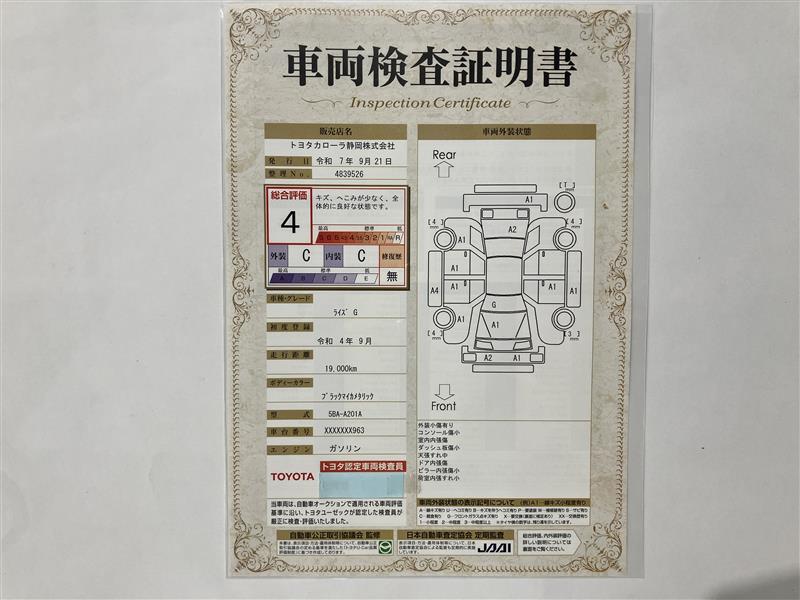 詳細及び現状の車両状態につきましては、店舗スタッフまでお尋ねください。 - 注2)上記と同様の評価点・状態表を「車両検査証明書」として店舗の展示車両に搭載しております。