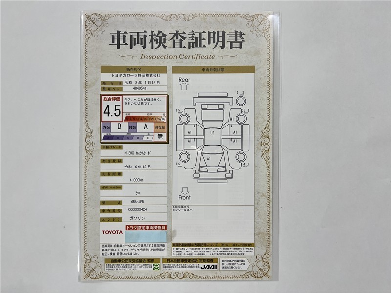 詳細及び現状の車両状態につきましては、店舗スタッフまでお尋ねください。 - 注2)上記と同様の評価点・状態表を「車両検査証明書」として店舗の展示車両に搭載しております。