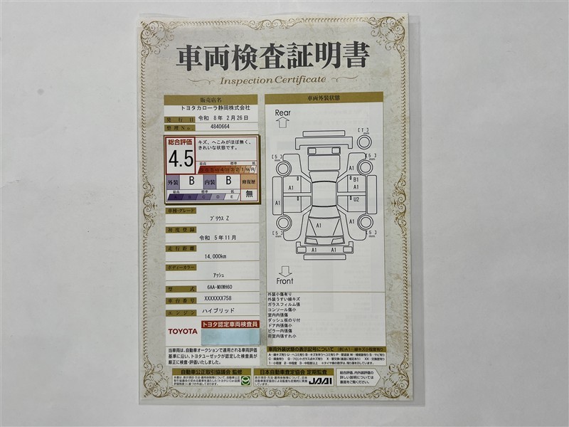 詳細及び現状の車両状態につきましては、店舗スタッフまでお尋ねください。 - 注2)上記と同様の評価点・状態表を「車両検査証明書」として店舗の展示車両に搭載しております。