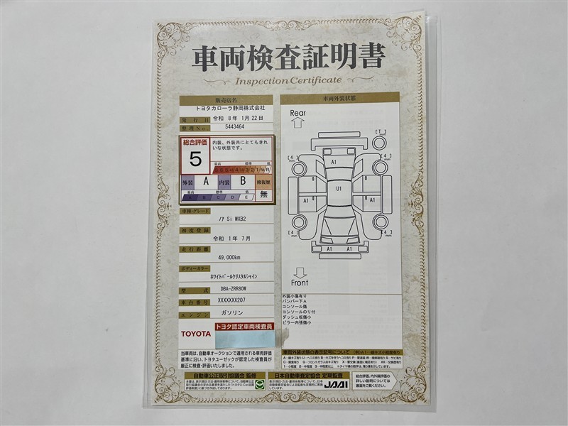 詳細及び現状の車両状態につきましては、店舗スタッフまでお尋ねください。 - 注2)上記と同様の評価点・状態表を「車両検査証明書」として店舗の展示車両に搭載しております。
