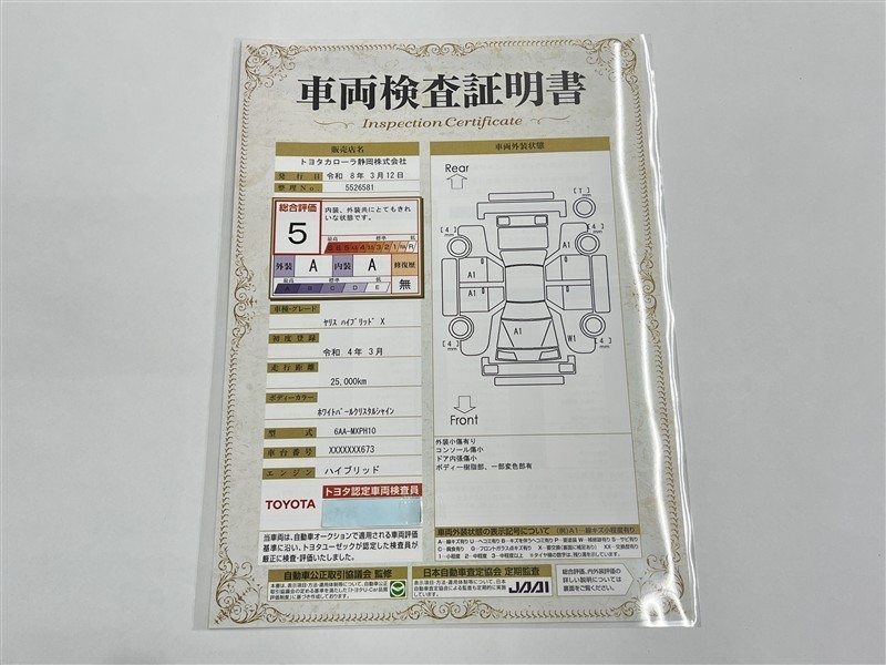 - 表示項目・方法・運用体制等について、自動車公正取引協議会の定める基準を満たした「トヨタU-Car品質評価制度」に基づき作成しております。