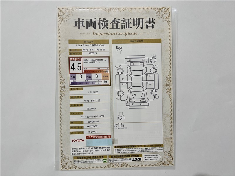 詳細及び現状の車両状態につきましては、店舗スタッフまでお尋ねください。 - 注2)上記と同様の評価点・状態表を「車両検査証明書」として店舗の展示車両に搭載しております。