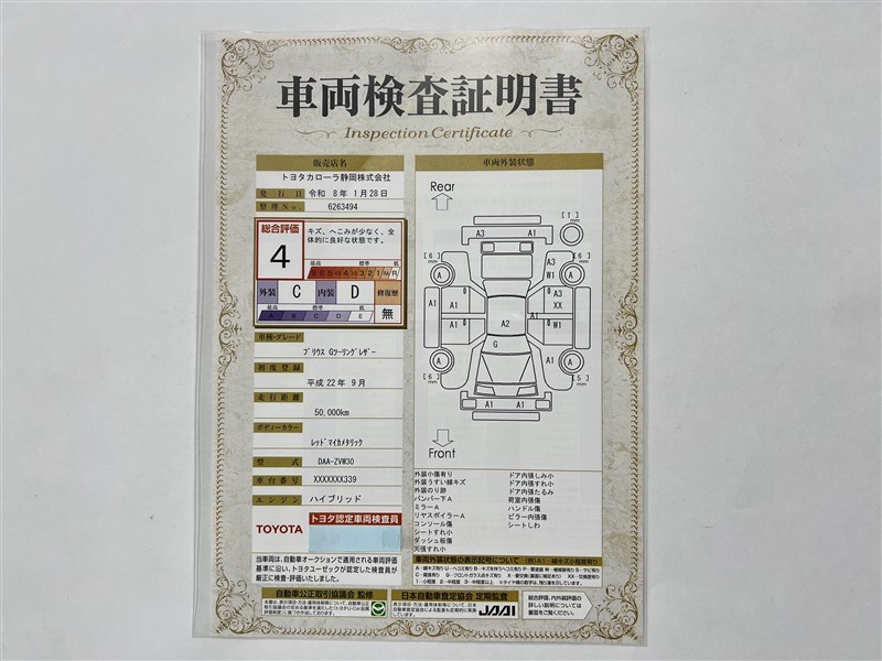 詳細及び現状の車両状態につきましては、店舗スタッフまでお尋ねください。 - 注2)上記と同様の評価点・状態表を「車両検査証明書」として店舗の展示車両に搭載しております。