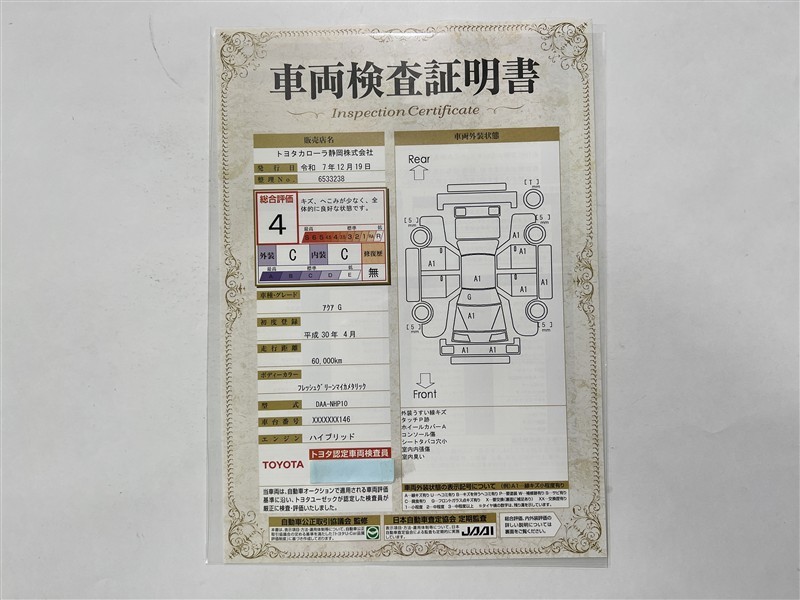 詳細及び現状の車両状態につきましては、店舗スタッフまでお尋ねください。 - 注2)上記と同様の評価点・状態表を「車両検査証明書」として店舗の展示車両に搭載しております。