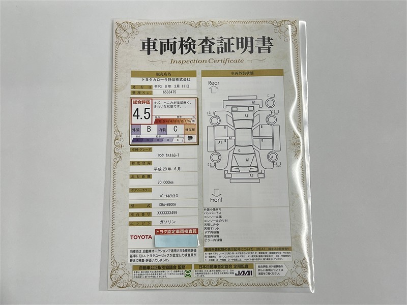 詳細及び現状の車両状態につきましては、店舗スタッフまでお尋ねください。 - 注2)上記と同様の評価点・状態表を「車両検査証明書」として店舗の展示車両に搭載しております。