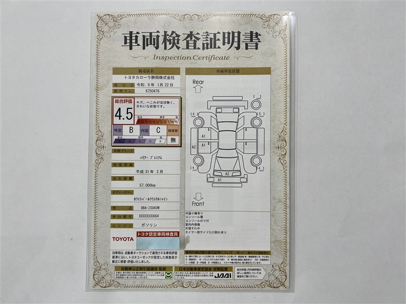詳細及び現状の車両状態につきましては、店舗スタッフまでお尋ねください。 - 注2)上記と同様の評価点・状態表を「車両検査証明書」として店舗の展示車両に搭載しております。