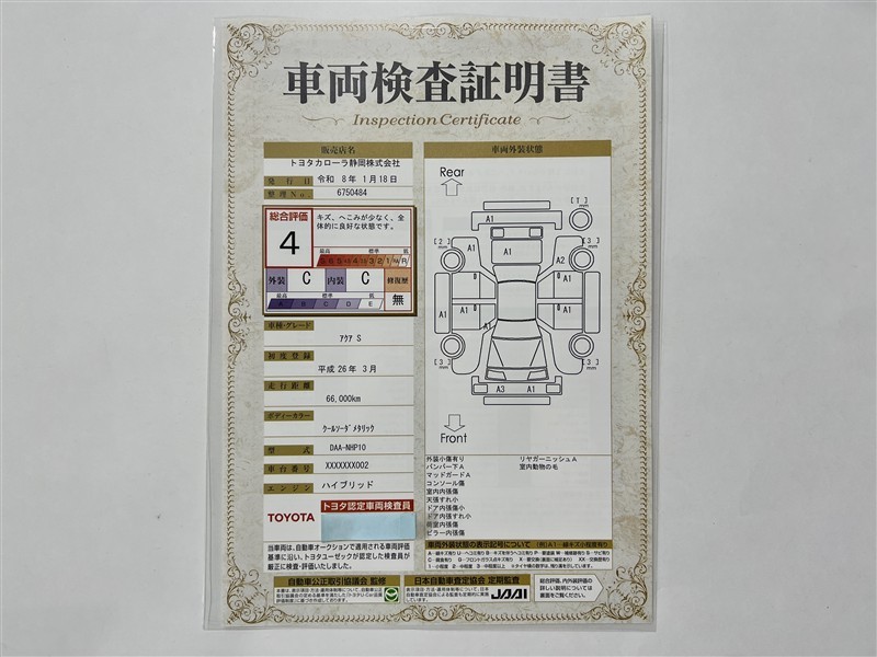 詳細及び現状の車両状態につきましては、店舗スタッフまでお尋ねください。 - 注2)上記と同様の評価点・状態表を「車両検査証明書」として店舗の展示車両に搭載しております。