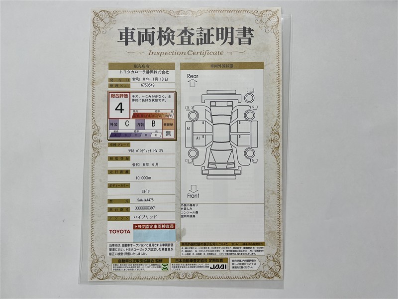 詳細及び現状の車両状態につきましては、店舗スタッフまでお尋ねください。 - 注2)上記と同様の評価点・状態表を「車両検査証明書」として店舗の展示車両に搭載しております。