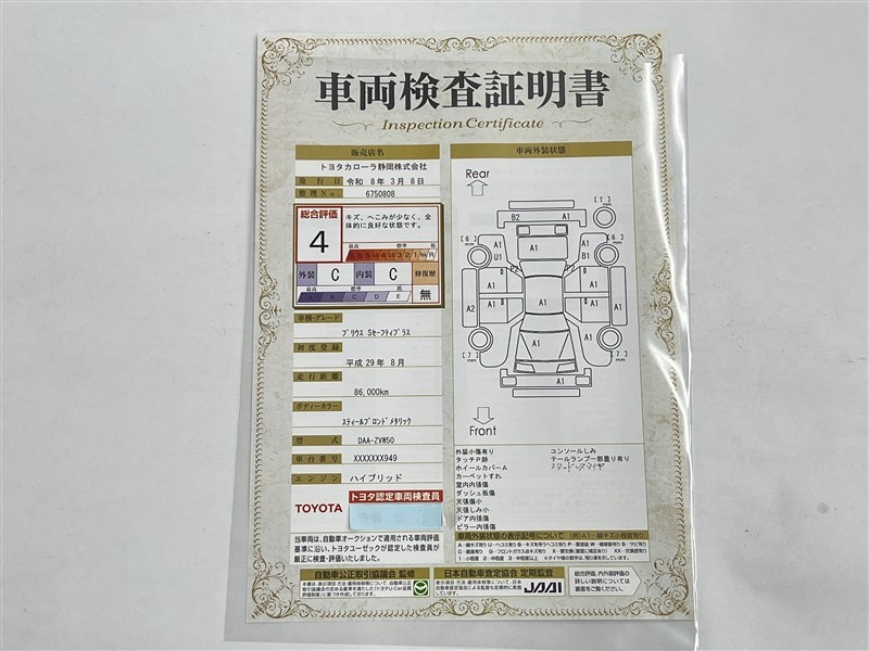 詳細及び現状の車両状態につきましては、店舗スタッフまでお尋ねください。 - 注2)上記と同様の評価点・状態表を「車両検査証明書」として店舗の展示車両に搭載しております。
