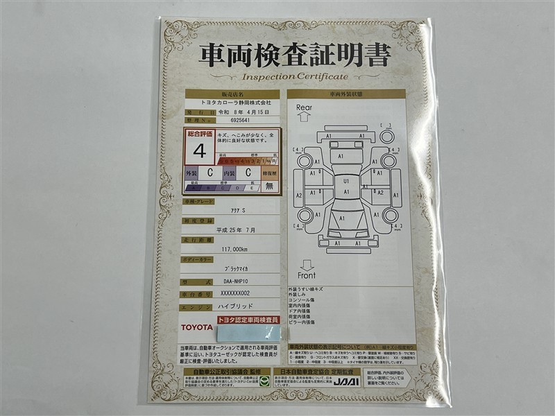 上記と同様の評価点・状態表を「車両検査証明書」として店舗の展示車両に搭載しております。