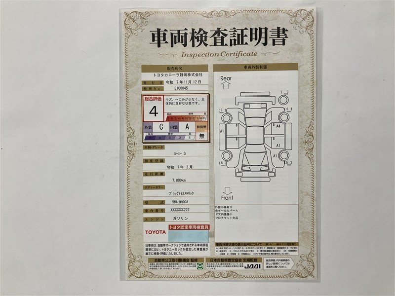 詳細及び現状の車両状態につきましては、店舗スタッフまでお尋ねください。 - 注2)上記と同様の評価点・状態表を「車両検査証明書」として店舗の展示車両に搭載しております。