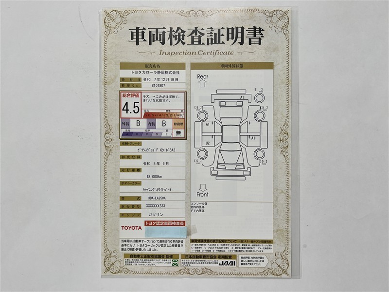 - 表示項目・方法・運用体制等について、自動車公正取引協議会の定める基準を満たした「トヨタU-Car品質評価制度」に基づき作成しております。
