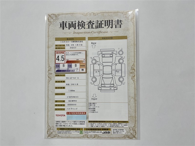 詳細及び現状の車両状態につきましては、店舗スタッフまでお尋ねください。 - 注2)上記と同様の評価点・状態表を「車両検査証明書」として店舗の展示車両に搭載しております。