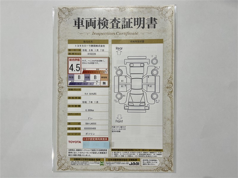 詳細及び現状の車両状態につきましては、店舗スタッフまでお尋ねください。 - 注2)上記と同様の評価点・状態表を「車両検査証明書」として店舗の展示車両に搭載しております。