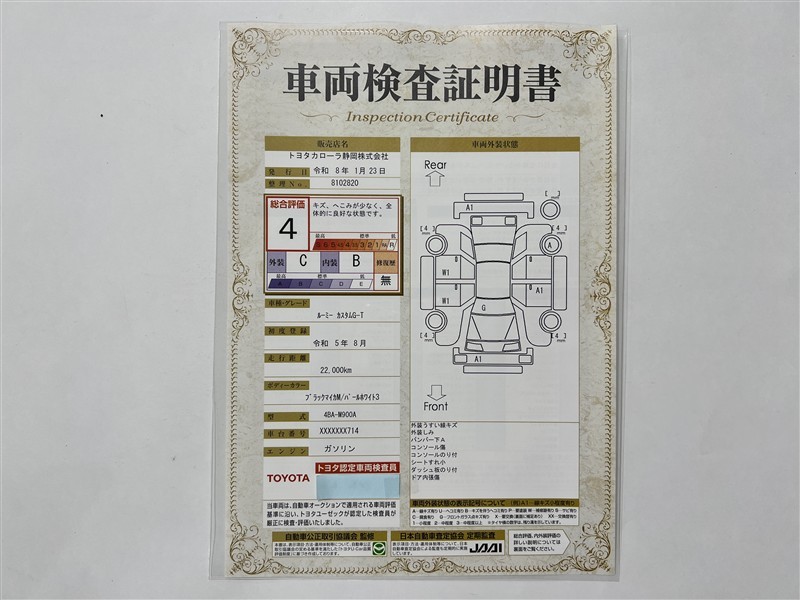 詳細及び現状の車両状態につきましては、店舗スタッフまでお尋ねください。 - 注2)上記と同様の評価点・状態表を「車両検査証明書」として店舗の展示車両に搭載しております。