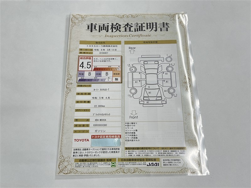 詳細及び現状の車両状態につきましては、店舗スタッフまでお尋ねください。 - 注2)上記と同様の評価点・状態表を「車両検査証明書」として店舗の展示車両に搭載しております。