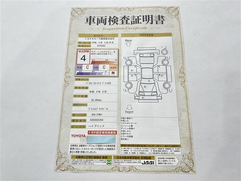 詳細及び現状の車両状態につきましては、店舗スタッフまでお尋ねください。 - 注2)上記と同様の評価点・状態表を「車両検査証明書」として店舗の展示車両に搭載しております。