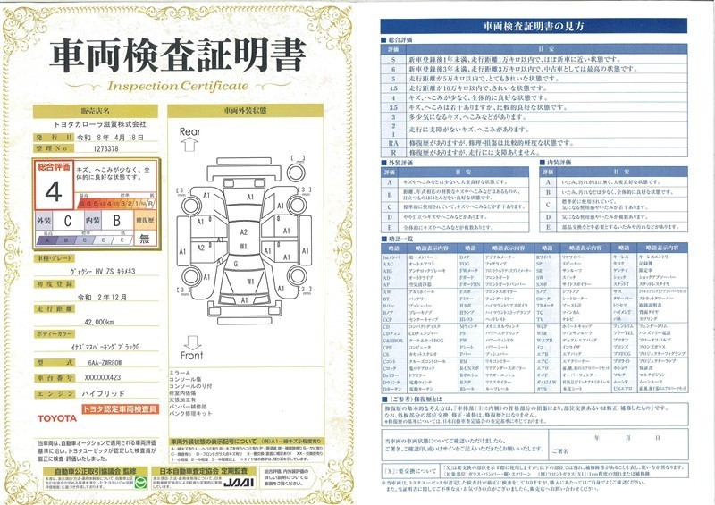 上記と同様の評価点・状態表を「車両検査証明書」として店舗の展示車両に搭載しております。