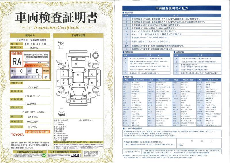 詳細及び現状の車両状態につきましては、店舗スタッフまでお尋ねください。 - 注2)上記と同様の評価点・状態表を「車両検査証明書」として店舗の展示車両に搭載しております。