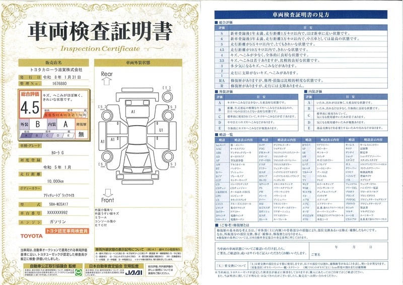 詳細及び現状の車両状態につきましては、店舗スタッフまでお尋ねください。 - 注2)上記と同様の評価点・状態表を「車両検査証明書」として店舗の展示車両に搭載しております。