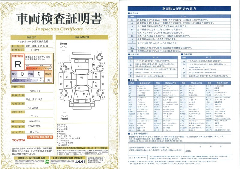詳細及び現状の車両状態につきましては、店舗スタッフまでお尋ねください。 - 注2)上記と同様の評価点・状態表を「車両検査証明書」として店舗の展示車両に搭載しております。