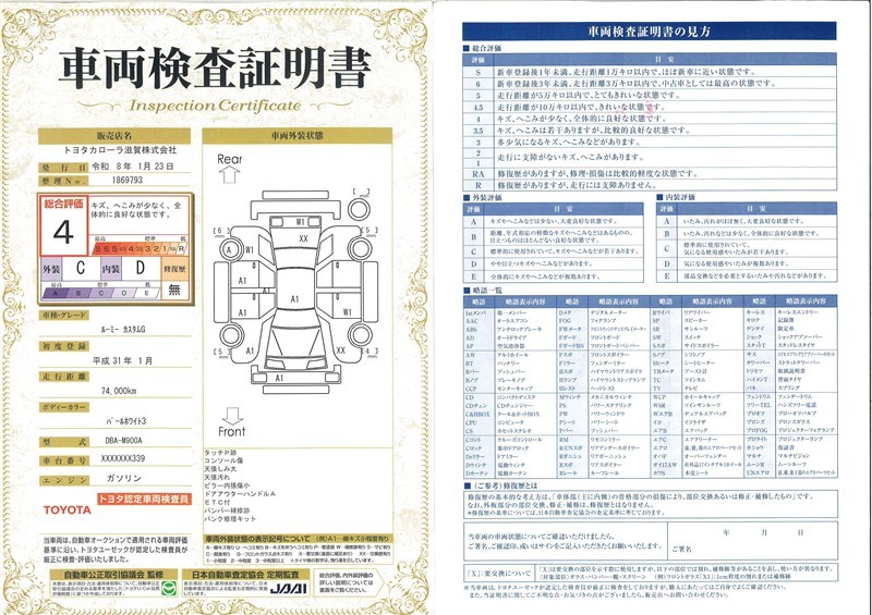 詳細及び現状の車両状態につきましては、店舗スタッフまでお尋ねください。 - 注2)上記と同様の評価点・状態表を「車両検査証明書」として店舗の展示車両に搭載しております。