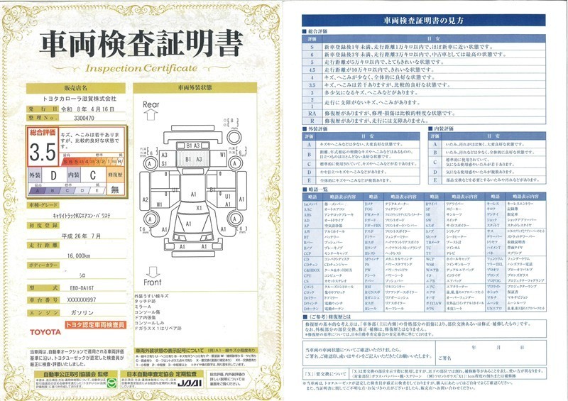 上記と同様の評価点・状態表を「車両検査証明書」として店舗の展示車両に搭載しております。