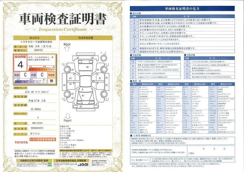 詳細及び現状の車両状態につきましては、店舗スタッフまでお尋ねください。 - 注2)上記と同様の評価点・状態表を「車両検査証明書」として店舗の展示車両に搭載しております。
