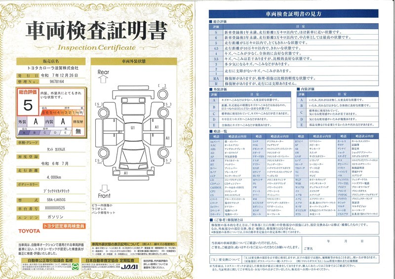 詳細及び現状の車両状態につきましては、店舗スタッフまでお尋ねください。 - 注2)上記と同様の評価点・状態表を「車両検査証明書」として店舗の展示車両に搭載しております。