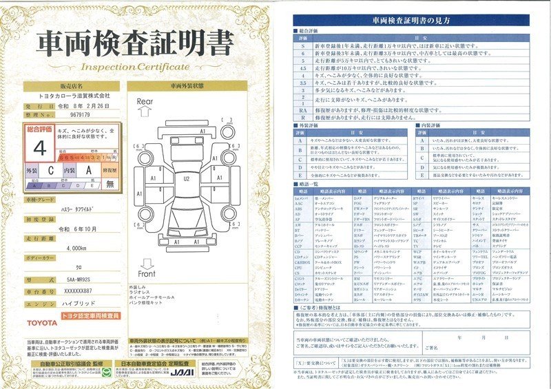 詳細及び現状の車両状態につきましては、店舗スタッフまでお尋ねください。 - 注2)上記と同様の評価点・状態表を「車両検査証明書」として店舗の展示車両に搭載しております。