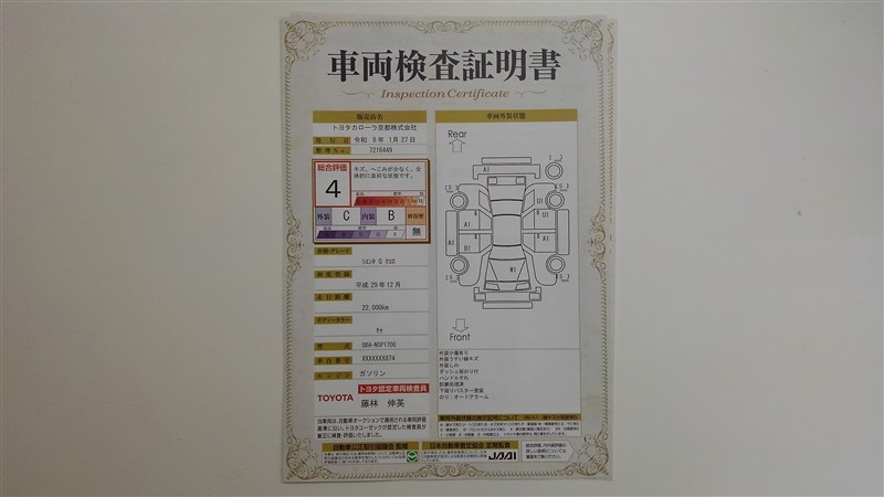 詳細及び現状の車両状態につきましては、店舗スタッフまでお尋ねください。 - 注2)上記と同様の評価点・状態表を「車両検査証明書」として店舗の展示車両に搭載しております。