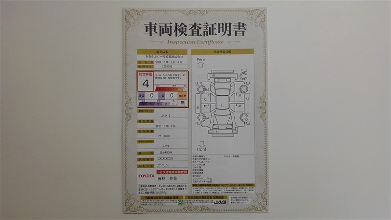 詳細及び現状の車両状態につきましては、店舗スタッフまでお尋ねください。 - 注2)上記と同様の評価点・状態表を「車両検査証明書」として店舗の展示車両に搭載しております。